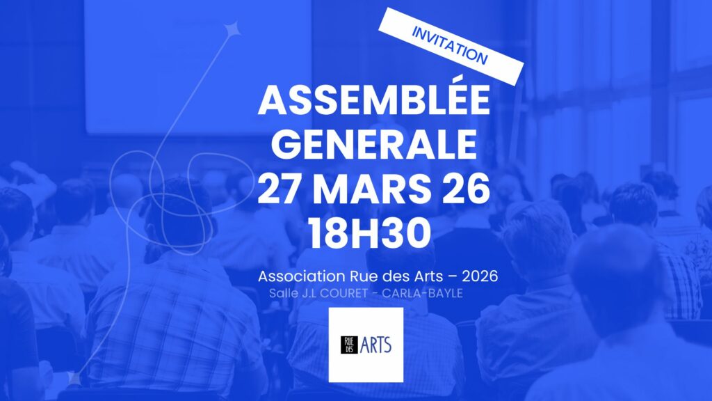 Nous avons le plaisir de vous inviter à l’assemblée générale de l’association Rue des Arts qui se tiendra le vendredi 27 mars 2026 à 18h30 à la salle Jean-Luc Couret (salle du Conseil municipal), place de l’Europe 09 130 Carla‐Bayle.