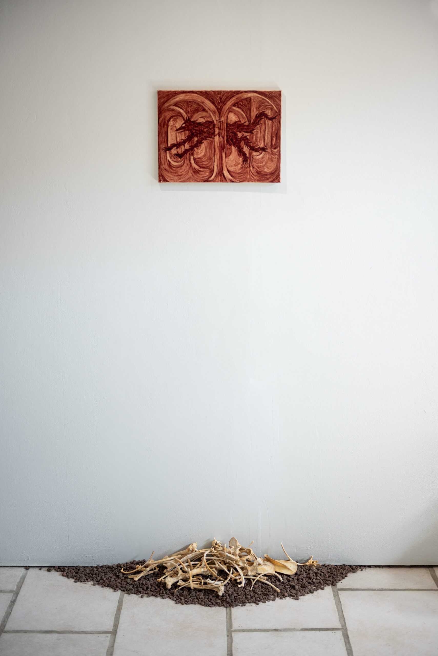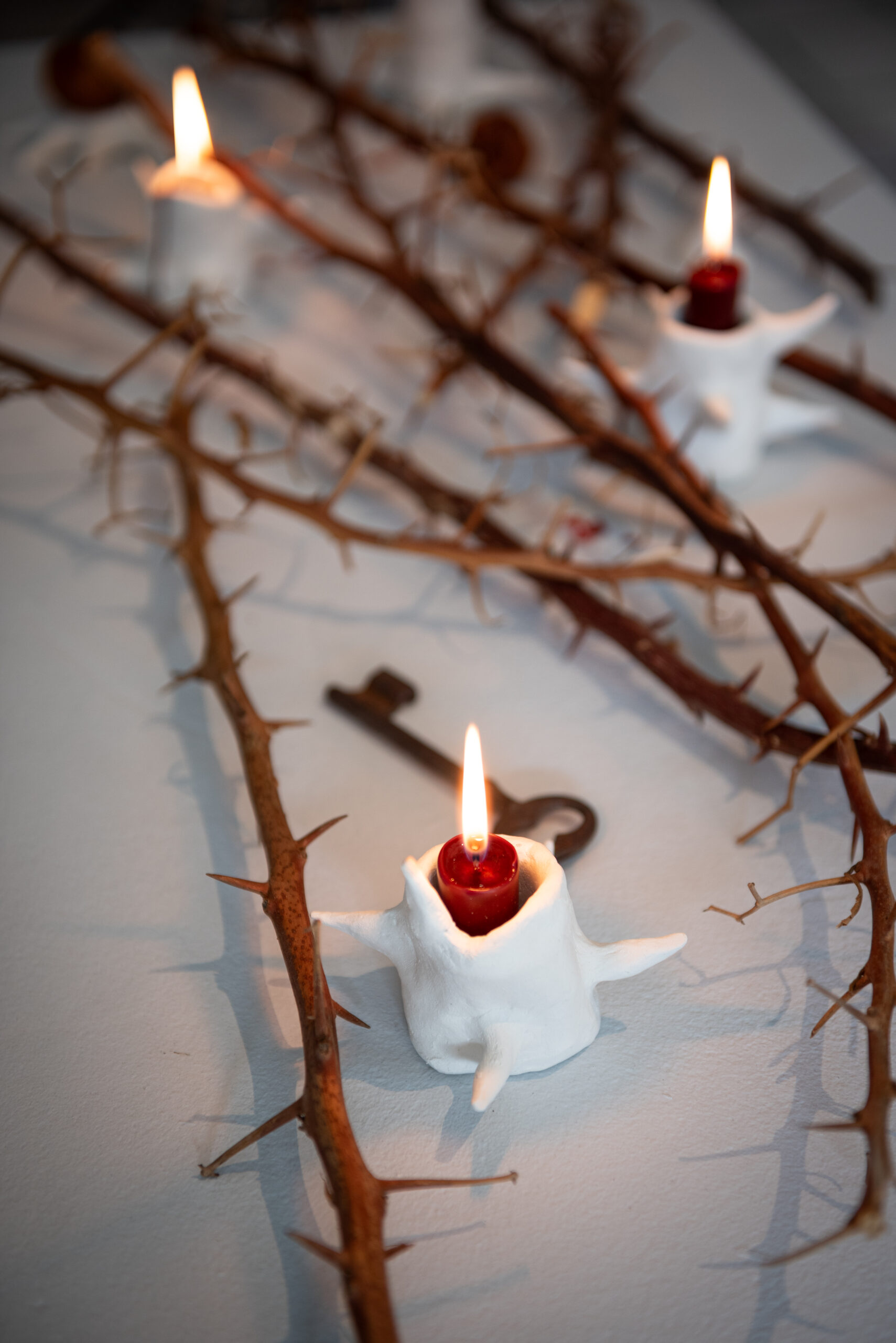 « L’autel de l’épine » qui siège au centre de l’exposition nous confronte à l’esthétique des lieux de culte. Des éléments de la mythologie chrétienne comme les épines qui entrent en résonnance avec des éléments païens ou la clé comme passage entre les mondes. Le rouge des bougies et leurs coulures évoquent le sang et les éventuels sacrifices qui s’y relient. La Galerie du Philosophe devient un lieu de questionnement du lien entre paganisme et religion. Bien plus, elle met à nu les rapports qu’ont entretenus ces croyances et rend visible les liens qui les unissent.
