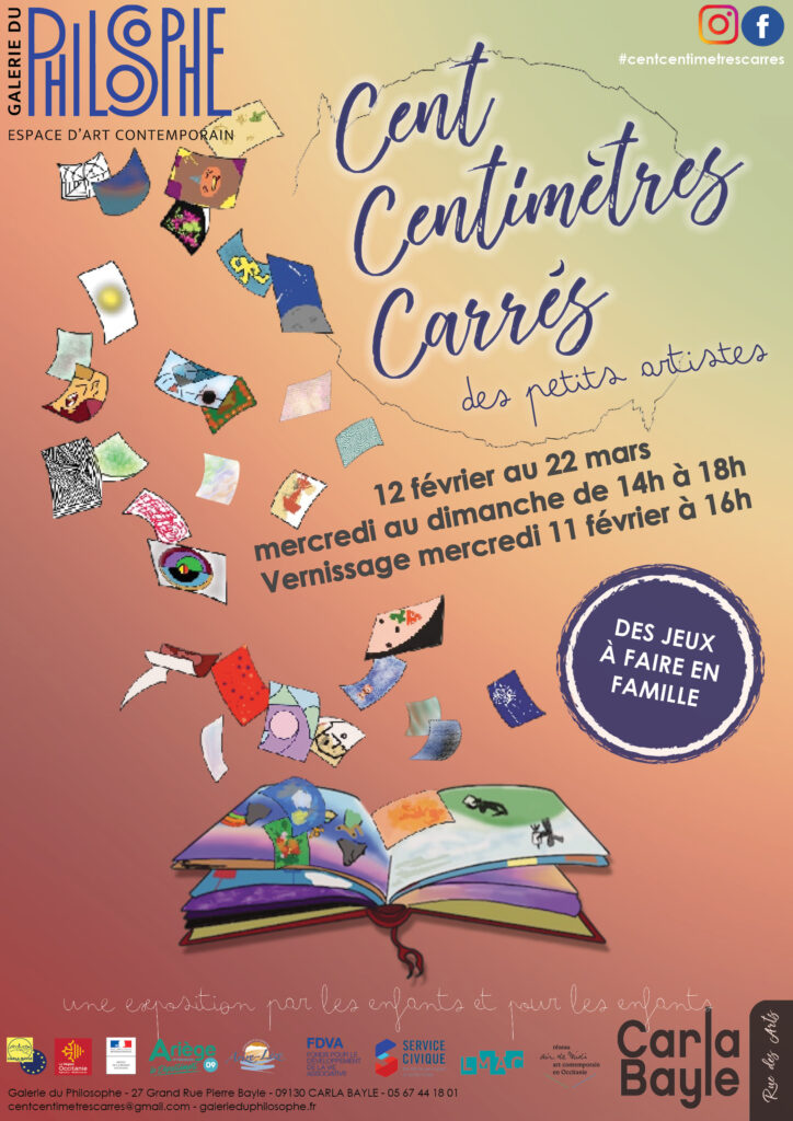 « Cent Centimètres Carrés » est une exposition collective organisée depuis 2012 par l’association Rue des Arts à la Galerie du Philosophe au Carla-Bayle. Que ce soit dans sa version pour les adultes, elle réunit professionnels et amateurs ou dans sa version « des petits artistes » pour les enfants, les contraintes du format sont les mêmes : l’œuvre doit tenir dans un cube de 10 x 10 x 10 cm. Après avoir laissé les murs de la galerie aux adultes en décembre-janvier, nous invitons les enfants à exposer leurs créations en février-mars. Mêmes contraintes et même adresse !