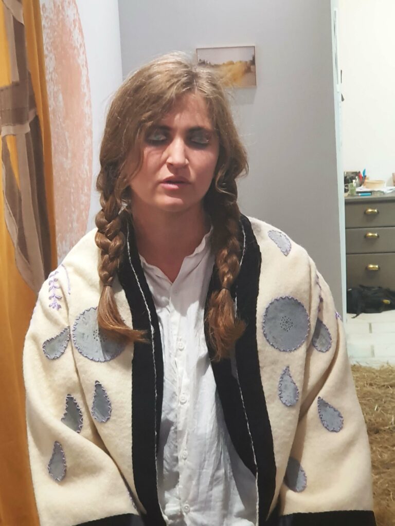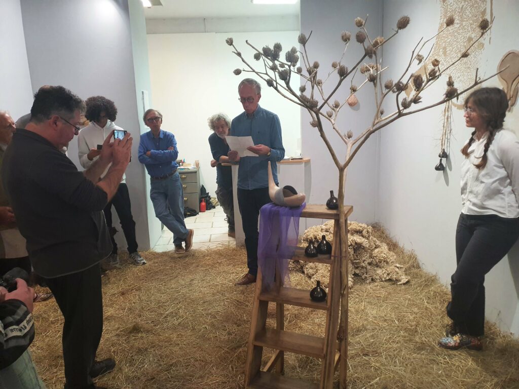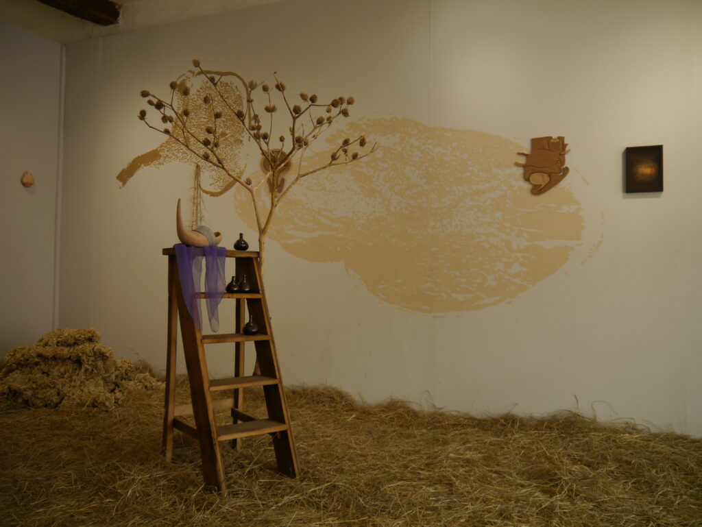 Non, pourtant, pas de grange ici et des objets nous le confirment : là, autour de nous, de la céramique, des photos, des toiles tendues à la verticale, des escabeaux et, sur ces escabeaux, un sabot, et un gilet… Ailleurs, sur les murs, des fresques brunes et d’étranges assemblages en argile : que voit-on ? Que doit-on lire ici ? Que doit-on comprendre ?