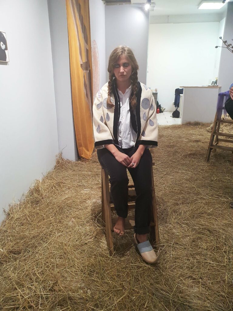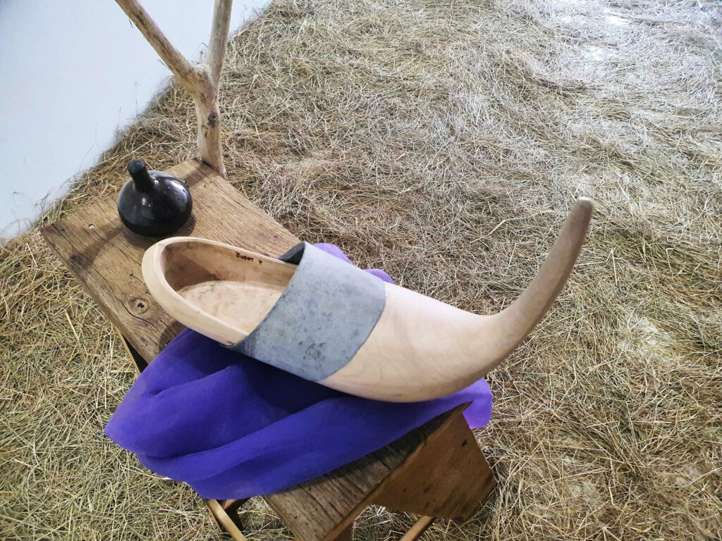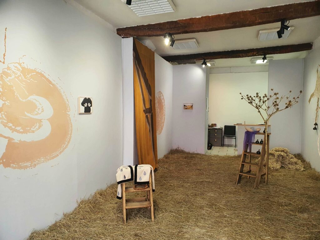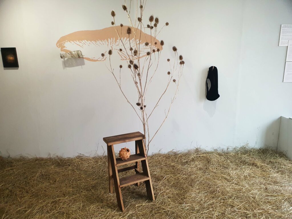Ce qui frappe en premier, lorsqu’on pénètre dans la galerie, c’est l’odeur. Et puis on s’étonne de marcher sur du foin et cela impose une certaine lenteur, une certaine prudence : nous trouvons-nous dans une grange ?
