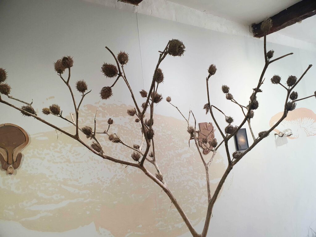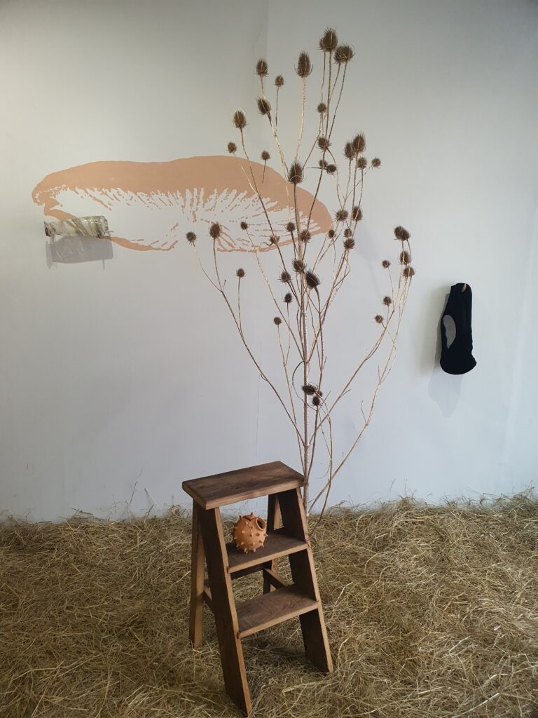 Eh bien, les champignons sont représentés sur les murs de la salle, peints avec de l’argile. Ils sont aussi ailleurs mais je vous laisse chercher… Le végétal est au cœur de la galerie, avec le datura, les cardères et la teinture. L’animal, ici, c’est l’être humain dont certaines parties du corps, montrées en coupe et constituées de plaques de céramique, sont sur les murs. Le minéral est donc là, lui aussi, comme il l’est dans les objets en verre.