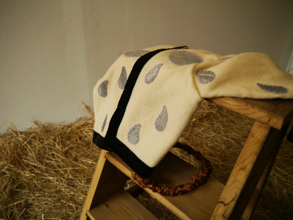 Les techniques que j’utilise s’additionnent et se retranchent comme les matières en fonction des moments, des lieux et des rencontres. Chaque objet est un souvenir et ils ont tous, ici, quelque chose de votif, comme si des êtres absents, vivants ou morts, proches ou loin de moi dans le temps et l’espace, étaient invités. Partout, ici, il y a des traces de gens que j’ai aimés ou de lieux qui m’ont émue pour leur étrangeté ou leur poésie : une grotte du Lot recouverte de graffiti, un sanctuaire grec, en Sicile, où gît un kouros de pierre, la maison de mon enfance, dont se dessine la silhouette de la charpente, dans le patchwork. La couronne de myosotis est le point d’orgue de cette invitation à se souvenir car le nom anglais de ces fleurs est « forget-me-not », « ne m’oublie pas”.
